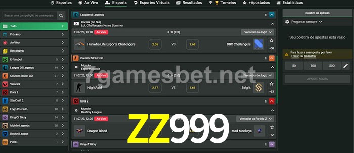 O ZZ999 oferece uma grande seleção de opções de apostas em e-sports com probabilidades competitivas